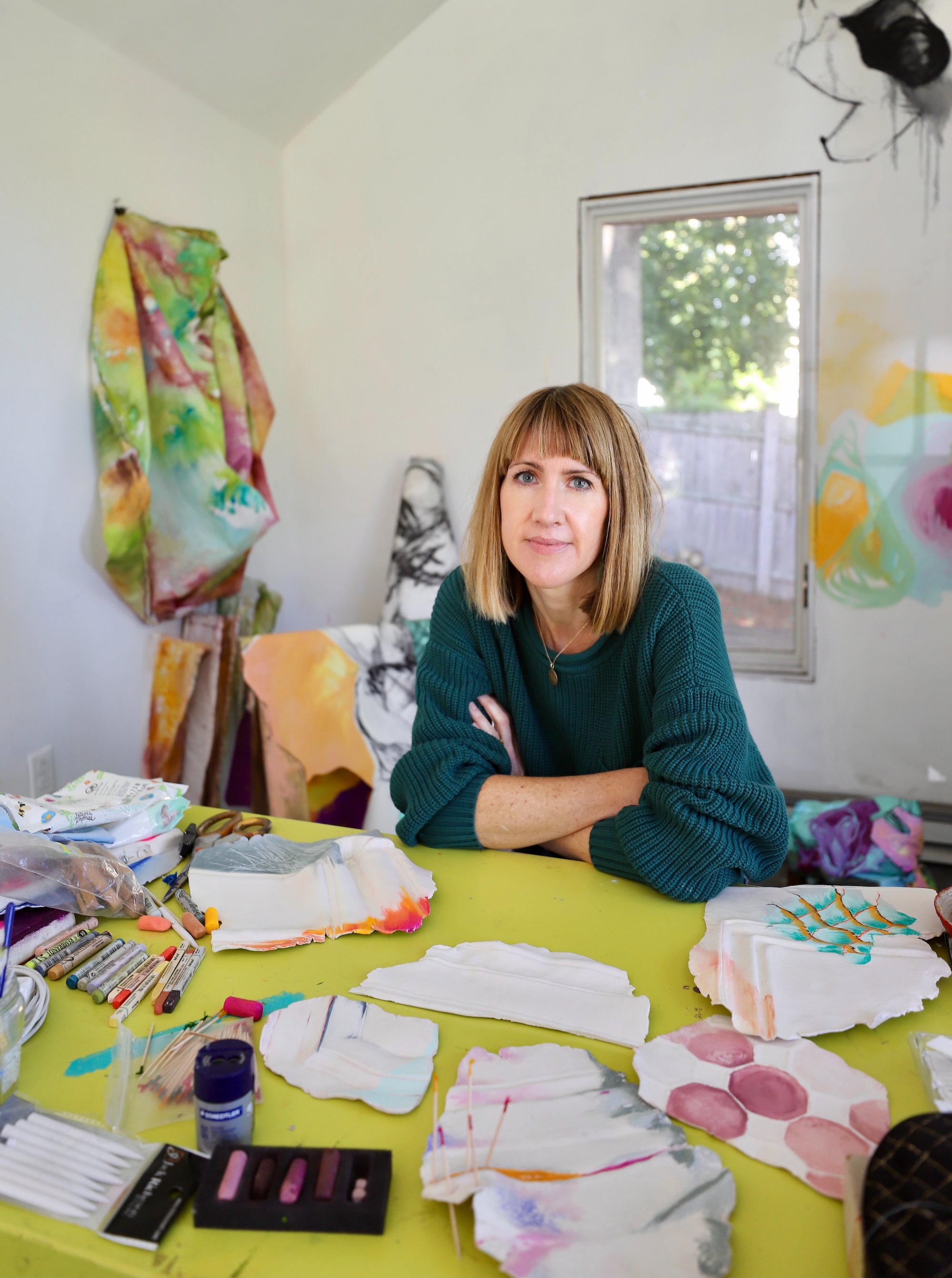 Kate Holcomb Hale is an interdisciplinary artist and educator who lives and works in greater Boston, MA. Kate’s practice uses sculpture, painting, video and craft to reimagine how we can soften and modify our world to accommodate our most vulnerable members of society and ease the load of care work. Collapsing kitchen tables, knotted handrails and resting columns act as vehicles to consider vulnerability, futility and the invisible labor of caregiving that occurs in domestic and public spheres. This body of work was conceived after a period of intense caregiving in which she lost her mother, father and brother in quick succession. Her installations combine playful colors, softness, familiar forms and humor to create receptive spaces for empathy and healing. Kate received her MFA in critical theory and studio art from Maine College of Art. She has exhibited throughout the United States and internationally, including at The Danforth Art Museum, Zabludowicz Collection, Praise Shadows Art Gallery, LaiSun Keane Gallery, Spilt Milk Gallery, and the Portland ICA.