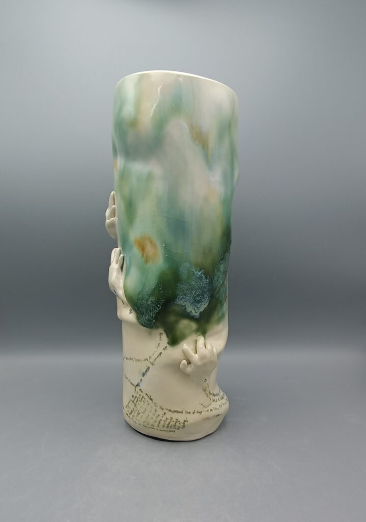 Ranging fabric, multimedia, ceramic and installation, these artworks forge a presence of their own. Deviating from the rectangle invites viewers to interact with artworks in relation to their own body as they enter a layered, textured space where works sit on the floor, hang from the ceiling, and climb up the walls.