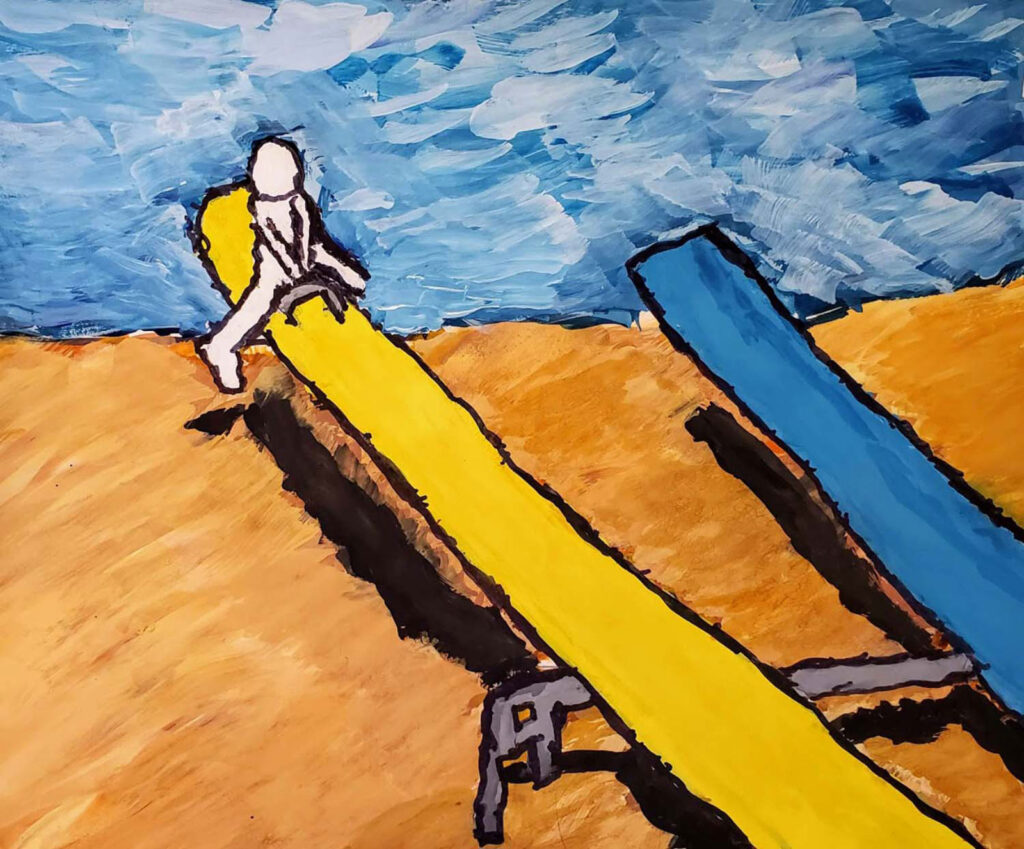 As a young child, playgrounds made the artist aware of what her body could not do: make it across the monkey bars; play hopscotch without falling; and swing fast and high. The playgrounds in the paintings are both real and imagined. Some are created from memories of places Tedesco visited as a child. Others are inspired by stories or imagery provided by friends. After serendipitously discovering art in college, the artist went on to prove that her slower pace and need for close observation could work to her advantage. From Tedesco’s brushstrokes to the actions performed by the figures in her paintings, the artist invites viewers to contemplate both the possibilities and complexities of moving through space and time.